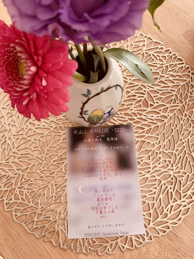 HOME > Live > Live 大山しずかLIVE -2025- ありがとうございました 2025年12月12日 先日の12/7大山しずかLIVE -2025- ご来場いただきまして誠にありがとうございました 新しい日々の始まりのような気持ちで迎えたライブ♪今年の終わりに、皆さまとひと時を、この一年を分かち合うことができて嬉しく、そして感謝の夜でした⭐︎ 何がやりたいのか、何をやれるのか、より向き合い、来年へ向けて精進して参ります!元気で、またお会いしましょう^o^♪ Twitter Share Pocket Hatena LINE URLコピー -Live